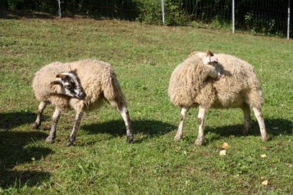 Die Merino-Mix-Ladies kamen aus einer Notsituation zu uns. Am Anfang war ich von diesem "Fressmaschinen" nicht so begeistert, da sie sowohl manchmal recht schwerfällig sein können, andererseits aber auch schnell in Panik geraten können und dann erst nach mehreren hundert Metern wieder ihren Kopf einschalten. Die drei haben mich aber sehr schnell von sich überzeugt. Sie sind sehr anhänglich. Unser "Fresssäckle" kommt immer schreiend und im gestreckten Galopp angerannt, wenn wir auf die Weide kommen. Es könnte ja sein, dass wir etwas zu fressen dabei haben